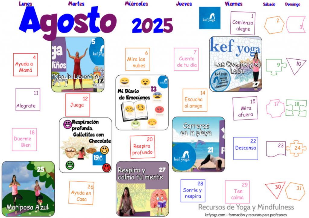 Calendario Agosto 2025 31 julio 2025 - ¡Hola a todos Aquí os dejamos un nuevo calendario descargable para el mes de Agosto de 2025. Este calendario esta creado en PDF y podéis ir a las actividades haciendo click en ellas desde vuestro teléfono u ordenador, si lo habéis imprimido podéis usar los códigos QRs que os llevaran a las distintas actividades. Nuestra intención es que contéis con una propuesta sana y divertida, así podéis practicar Yoga y Mindfulness durante todo el mes, y si queréis más actividades siempre podéis venir a nuestra página y nuestro canal de YouTube. Descarga aquí tu calendario No dejéis de compartir vuestro Yoga y nuestro calendario. Vuestra Yoguini de cabecera, Blanca Sissa Nuestro canal youtube: youtube.com/kefyoga Recuerda que en Kef Yoga te ofrecemos formación. Para saber más has click aquí Sigue leyendo